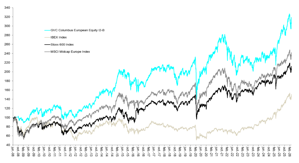 Rentabilidad – Marzo 2026: Durante marzo 2026, el fondo Pareturn Columbus Clase I2 sufrió una caída del 8,1% en línea con los índices europeos de renta variable, que cayeron un 8%. En los últimos 12 meses el fondo acumula una subida del 24,5%, superando al Stoxx 600 que en el mismo periodo subió un 9,2%. Gracias a su sólida evolución, el fondo se sitúa en el primer cuartil de su categoría a 1, 3 y 5 años, según datos de Morningstar. Desde su lanzamiento en junio de 2008, el fondo acumula una apreciación del 213% batiendo consistentemente a los principales índices bursátiles europeos.